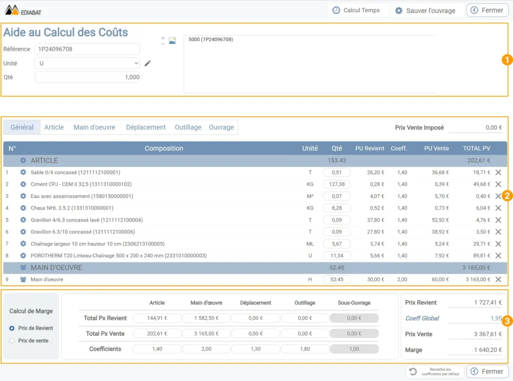 - Gestion des composantes de l’ouvrage par catégorie dans les onglets suivants : articles, mains d’œuvres, déplacements, locations, ouvrages…