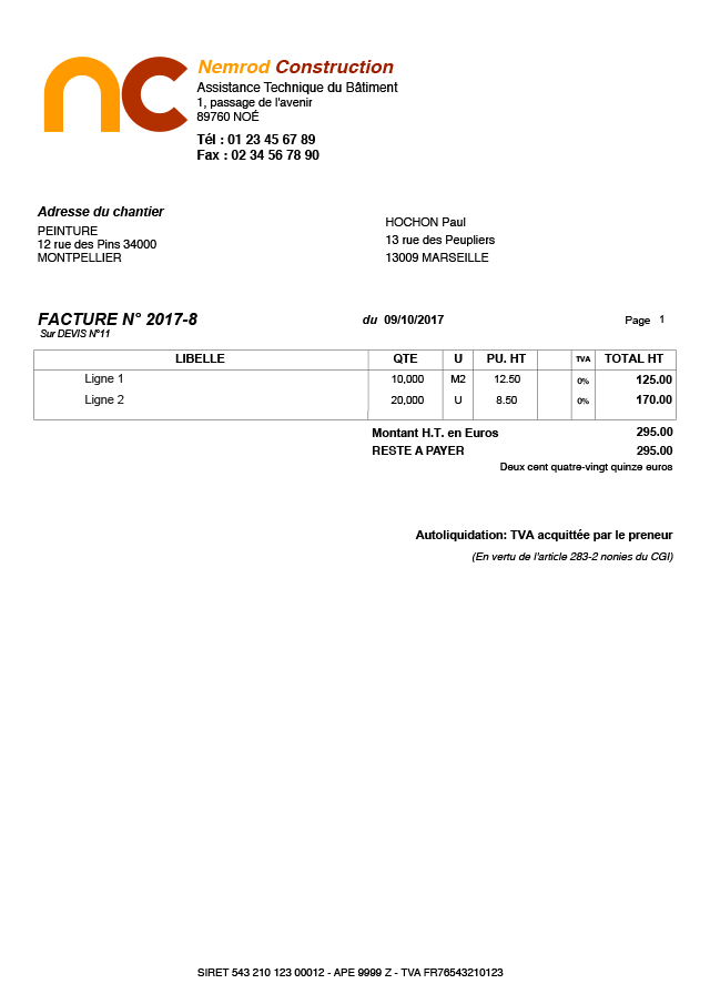 - Facturer la main d’oeuvre et les fournitures en HT sans TVA