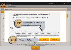 Dans la fenêtre Authentification qui s’ouvre, entrer le numéro d’activation de la licence (1) (5/12) de votre mail. Cliquer sur le bouton Valider (6/12).
