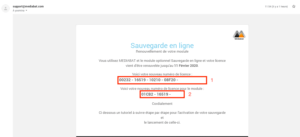 Si vous bénéficiez de l’option de sauvegarde, nous vous invitons à récupérer le code de licence (1) et le code du module (2) se trouvant dans le mail que vous recevez à la suite de votre achat.